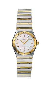 Blending classic timepiece design with refined European style, this Omega Constellation women's watch offers graceful lines and a medium-sized width. Mixing both stainless steel and 18 karat gold, this Constellation offers an appealing balance of luxury, durability, and precision (with its Swiss quartz watch movement). Its brushed silver stainless steel case is topped by an 18 karat gold bezel that features engraved Roman numerals in black and curved claw accents at 3 and 9 o'clock. The silver stainless steel bracelet band flows seamlessly from the case and is slightly tapered. It's accented by thin horizontal bands of 18 karat gold that separate the silver links and stretch fully across the width of the band. It's joined by a secure fold over push button clasp.The shimmery white mother-of-pearl white dial background also includes gold-tone Dauphine hands (with seconds hand) and baton dial markers. Other features include a scratch-resistant and glare-proofed domed sapphire crystal, a distinctive Cabochon crown, and water resistance to 50 meters (165 feet). The watch case measures 22.5mm (0.89 inches) across and 8mm (0.31 inches) deep.