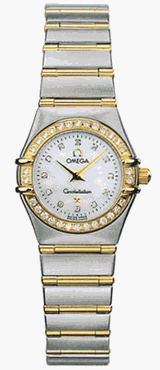 Blending refined European design with glittery diamond-accented style, this Omega Constellation women's watch offers graceful lines and a slender width for even the more delicate of wrists. Mixing both stainless steel and 18 karat gold, this Constellation offers an appealing balance of luxury, durability, and precision (with its Swiss quartz watch movement). And this watch will capture attention immediately as you walk into the ballroom (or boardroom) with its tiny diamond dial markers and shiny, fully diamond encrusted 18 karat gold bezel. The silver stainless steel bracelet band flows seamlessly from the case and is slightly tapered. It's accented by thin horizontal bands of 18 karat gold that separate the silver links and stretch fully across the width of the band. It's joined by a secure push-button safety clasp.The shimmery white mother-of-pearl white dial background also includes gold-tone Dauphine hands (with seconds hand). Other features include a scratch-resistant and glare-proofed domed sapphire crystal, a distinctive Cabochon crown, and water resistance to 30 meters (99 feet) The watch case measures 22.5mm (0.89 inches) across and 8mm (0.31 inches) deep.