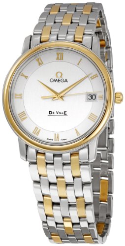 Two tone stainless steel and 18kt yellow gold case with a two tone stainless steel and 18kt yellow gold bracelet. Fixed bezel. Silver dial with gold-tone hands and roman numeral hour markers. Date display appears at the 3 o'clock position. Quartz movement. Scratch resistant sapphire crystal. Case diameter: 34 mm. Case thickness: 6.3 mm. Push button fold over clasp. Water resistant at 30 meters/ 100 feet. Functions: hours, minutes, seconds, calendar. Omega deville two tone mens watch 4310.32.Available at Amazon ******** Check Price Now! ********